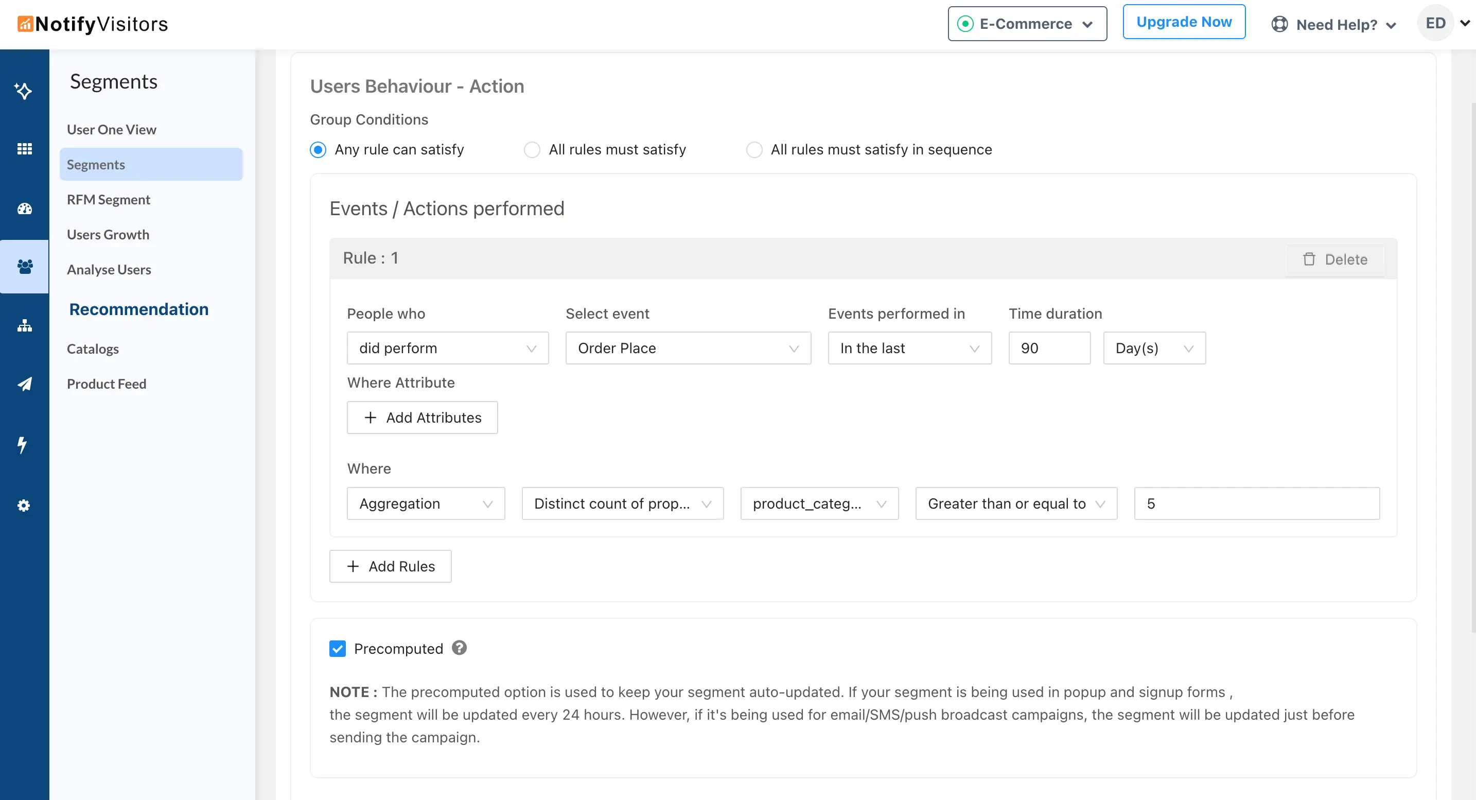 Create a segment of users who performed “Order Place” in the last 90 days. Apply Distinct count on the attribute product_category ≥ 5.