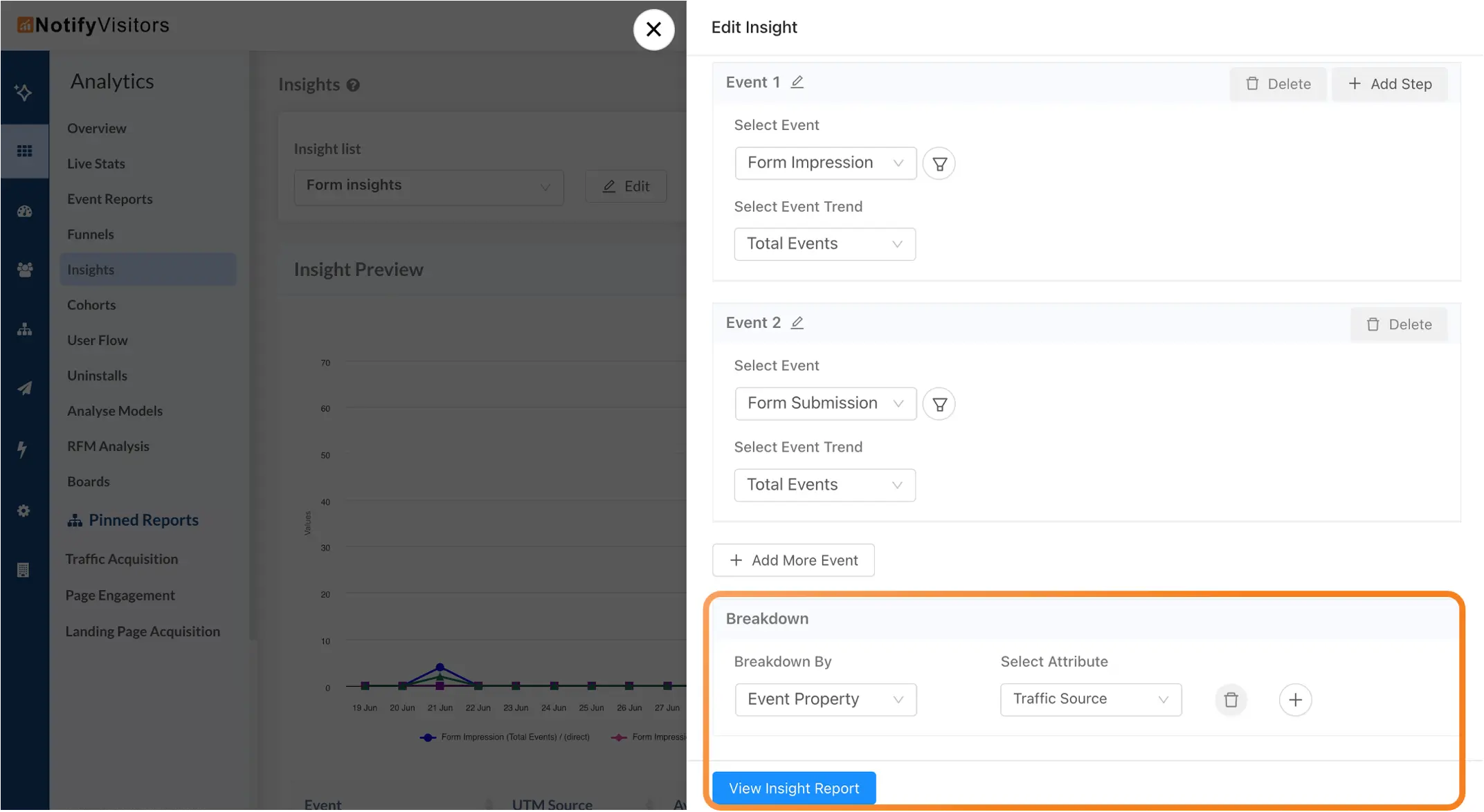 When creating an Insights report with one or more events, you can now apply a Breakdown by filter.
