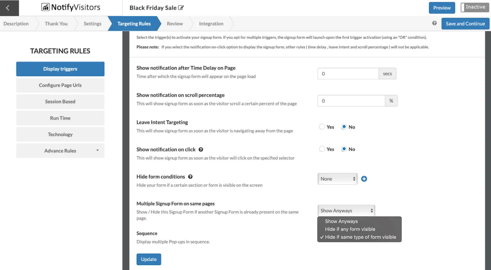 Previously, you could control whether a new signup form should appear if another form was already visible on the page. Now, we’ve added more flexibility with a new condition that lets you hide only the same type of form when it's already present.
