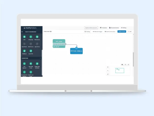 NPS resolution is inevitable to push your promoters to promote the brand, fetch the attention of the passives with catchy offers and try to build a brand image with the detractors. NotifyVisitors lets you simplify the pain-points of the customers by sending NPS in a user journey. Create the event and imply conditions on it as per the actions/behaviors of the users and ask the reasons for their ratings.