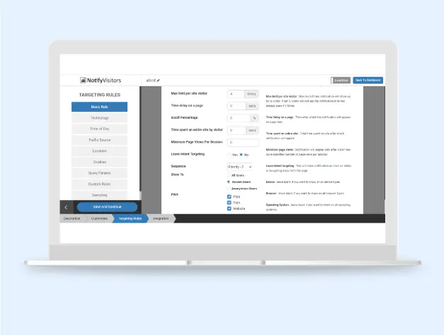 Targeting rules are necessary to determine the conditions as to whom and when should the notifications or campaigns be shown to the subscribers or audience. Recently, NotifyVisitors have added new features of adding PWA targeting rule while creating banners, surveys, lead forms, and push notifications. The rule implies that you can choose to show the campaigns or notifications in your PWA app, TWA app or on your website.