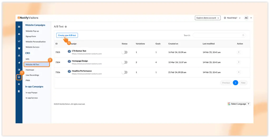 To create an A/B test campaign in NotifyVisitors, go to the Onsite Campaign section and select Website A/B Test under the CRO category. Here, you’ll find a list of existing campaigns, and to create a new one, simply click the “Create New A/B Test” button.