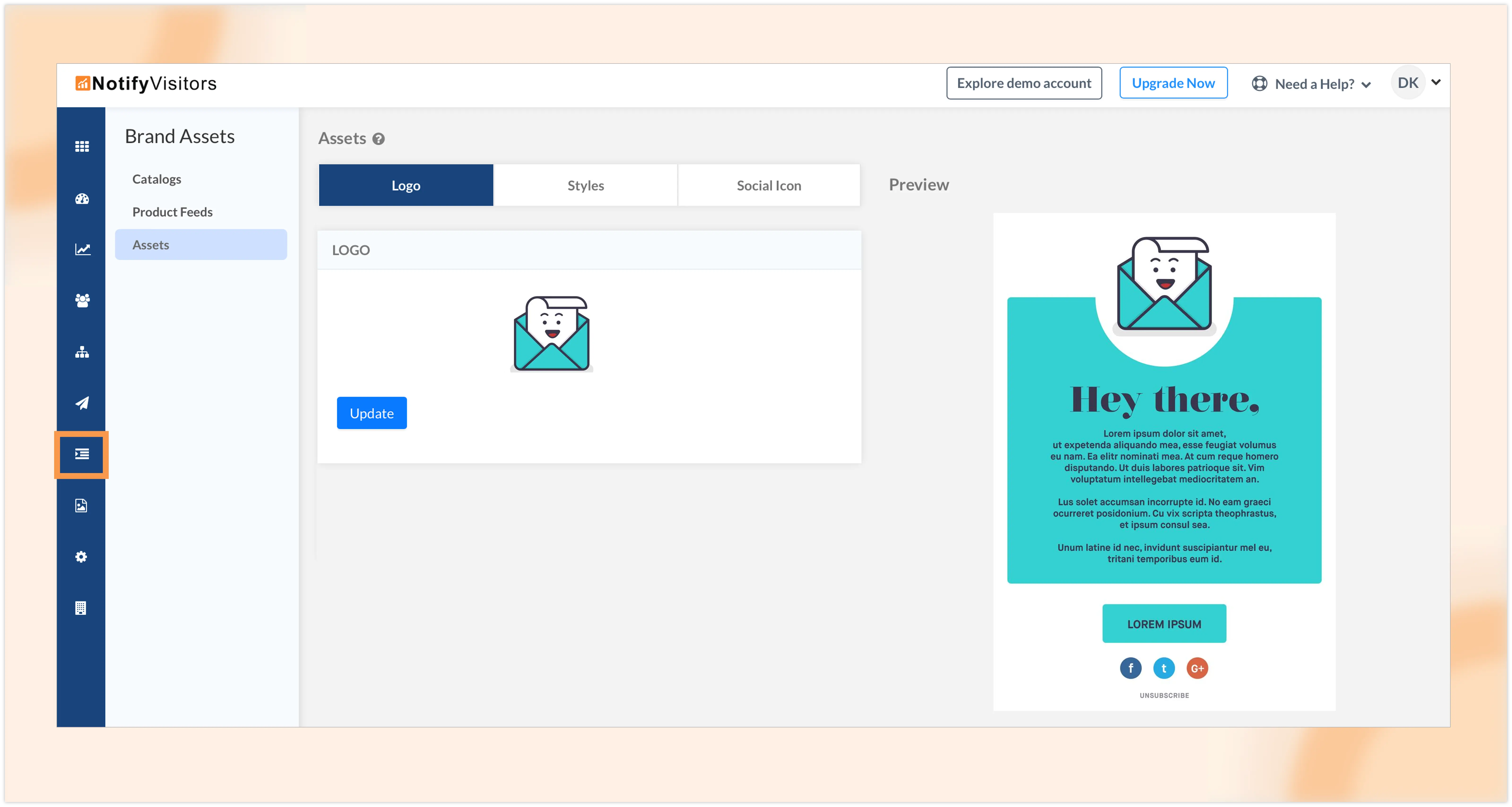 Gone are the days of manually changing colors, fonts, and buttons on each template to match your brand. With the new assets section, you can now define your brand styles in one central location. Simply add your brand logo, select your preferred colors, customize font, and even include your social media buttons with links.