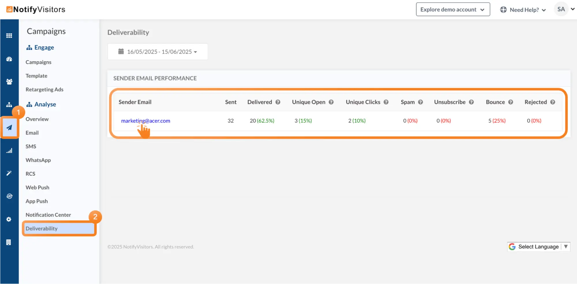 To view the analytics of your sender email go to the campaigns section, then under the engagement section, select the deliverability tab. Here you’ll get KPIs such as sent, delivered, unique open/clicks, spam, unsubscribe, and bounce rate, along with rejected emails.