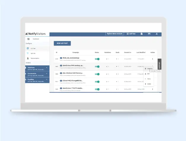 At NotifyVisitors, you can create AB testing campaigns and understand the AB testing analytics as well. NotifyVisitors gives you a panoramic view of all your ab testing campaigns. Analyze the insights of the campaign such as the goal conversions, total visitors on your ab testing campaigns. Briefly, you can have a campaign overview.