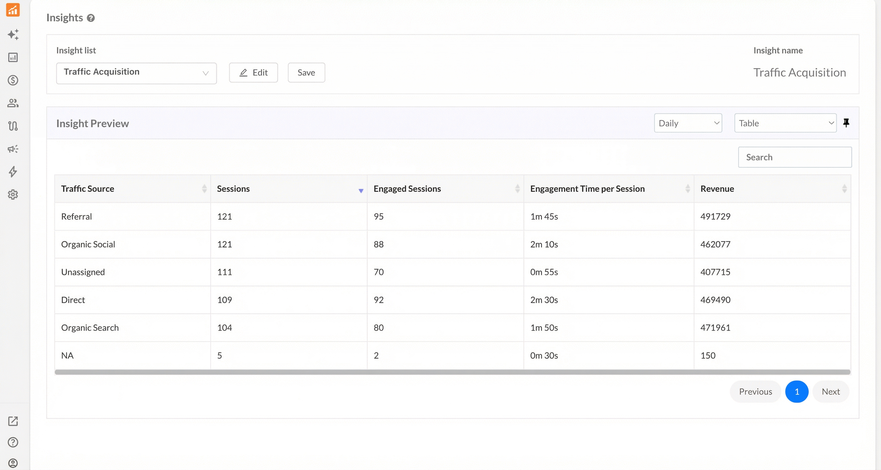 3. Measure Revenue Impact: The Revenue column shows which sources convert best. A source with fewer sessions but higher revenue is more valuable than one with high traffic but low conversions.