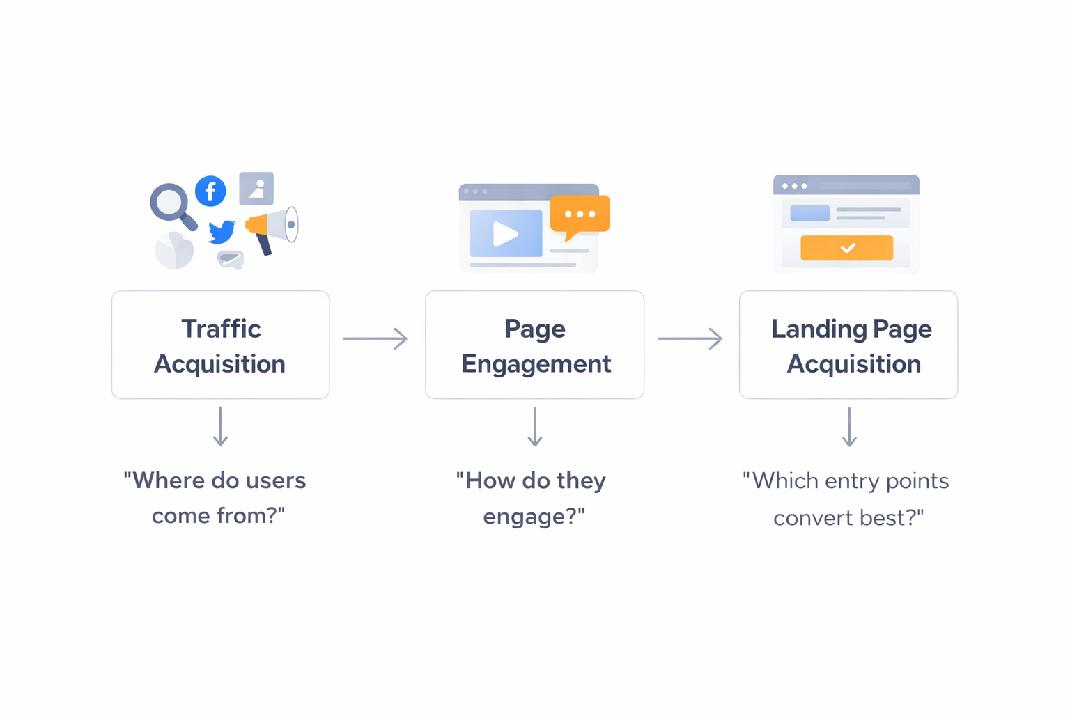 Understanding where your traffic comes from, how users engage with your pages, and which landing pages drive the most acquisitions is the foundation of any data-driven growth strategy.